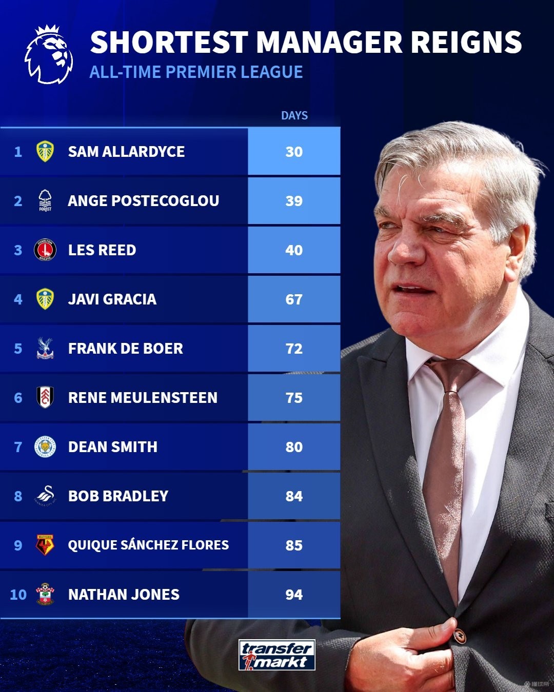 北京时间3月7日,在托特纳姆热刺新帅图多尔上任仅三周就被认为可能下课的情况下,德转统计出了英超历史最短命的10位主帅,2023年执教利兹联仅30天就下课的阿勒代斯排名第1,波斯特科格鲁第2。英超历史最短命主帅:1.阿勒代斯(利兹联)30天2.波斯特科格鲁(诺丁汉森林)39天3.莱斯-里德(查尔顿)40天4.哈维-格拉西亚(利兹联)67天5.弗兰克-德波尔(水晶宫)72天6.穆伦斯汀(富勒姆)75天